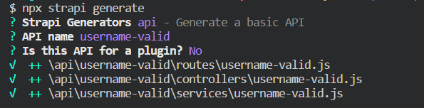완료되면 기존의 api 폴더 하위에 우리가 입력했던 API name 의 값대로 디렉터리가 하나 생성되고, 그 하위 폴더에 controllers, routes, services 디렉터리가 생성된다.