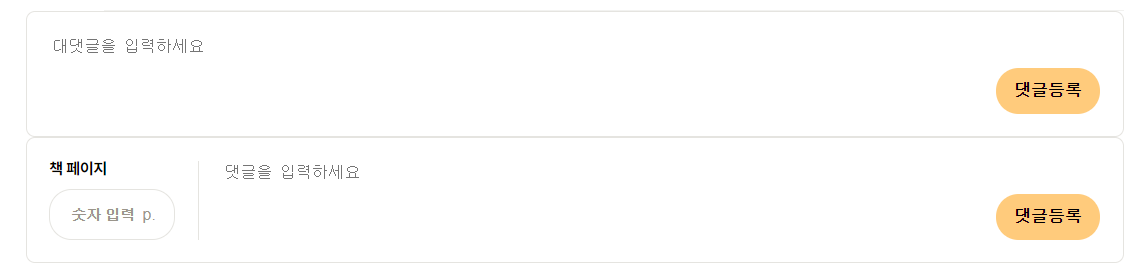 댓글과 대댓글을 작성할 수 있는 컴포넌트이다. 둘은 공통적으로 댓글 입력을 받는 부분과 등록 버튼이 존재한다. 하지만 댓글을 작성하는 input 컴포넌트에는 페이지를 입력할 수 있는 다른 input 요소가 존재한다는 점이 다르다. 그래서 대댓글 컴포넌트를 재사용 가능한 단위로 만들고, 댓글 컴포넌트에서는 이를 확장하여 사용해 보았다.