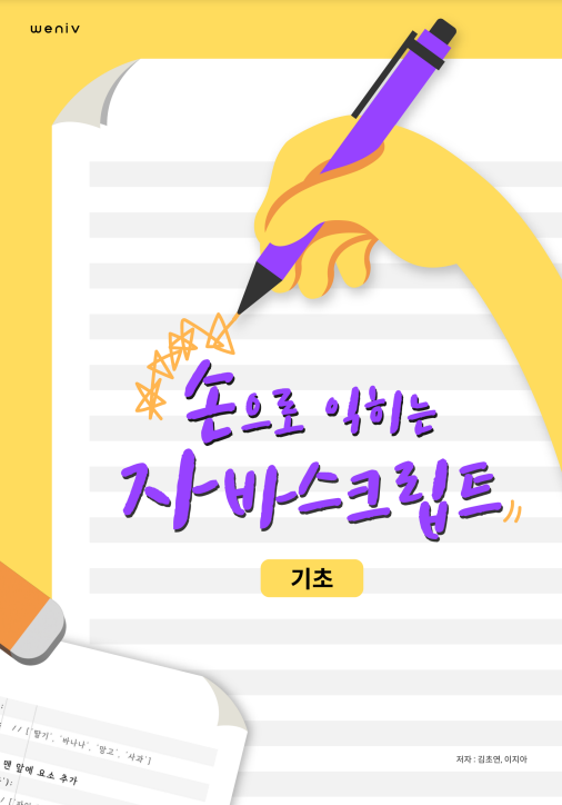 드디어 우리의 책 "손으로 익히는 자바스크립트 기초"가 출간되었다. 리디북스에서 무료로 볼 수 있다. 우리는 원고 작성 및 포토샵 작업만을 했으며 이를 제외한 표지 제작, 출판 등의 모든 일들은 위니브 측에서 도와주셨다. 정말 감사드린다.