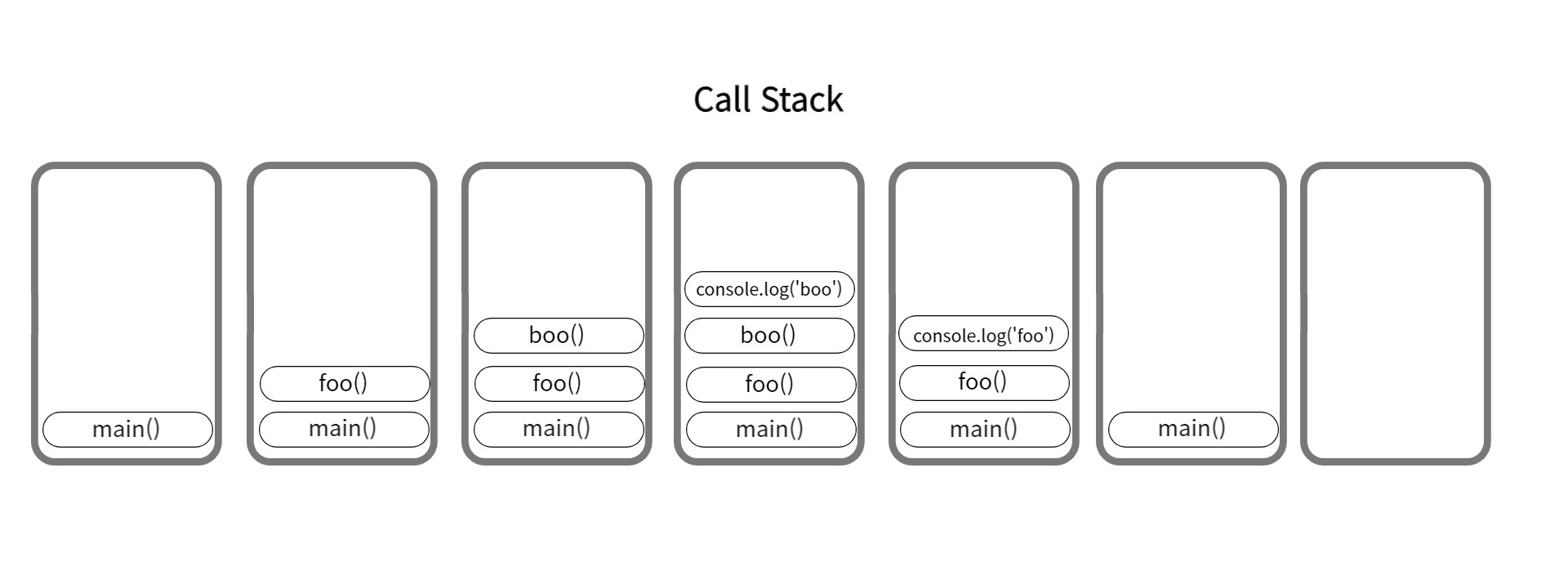 전역 실행 컨텍스트를 뜻하는 main 함수 위에 foo 함수가 호출 되면서 호출 스택에 푸시된다. foo 함수는 boo 함수를 호출하고, boo 함수도 호출 스택에 푸시된다. boo 함수 안에서 console.log('boo')가 실행되고, boo 함수는 종료되므로 boo 함수는 호출 스택에서 팝하여 제거된다. 그 뒤 foo 함수 내부의 console.log('foo')가 실행이 되고, foo 함수도 종료되면서 foo 함수도 팝하여 호출 스택에서 제거된다. 모든 코드가 실행되었으므로 전역 실행 컨텍스트 main 함수도 팝하여 제거되고 호출 스택에는 아무것도 남아있지 않게 된다.